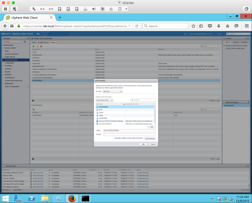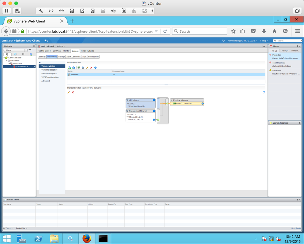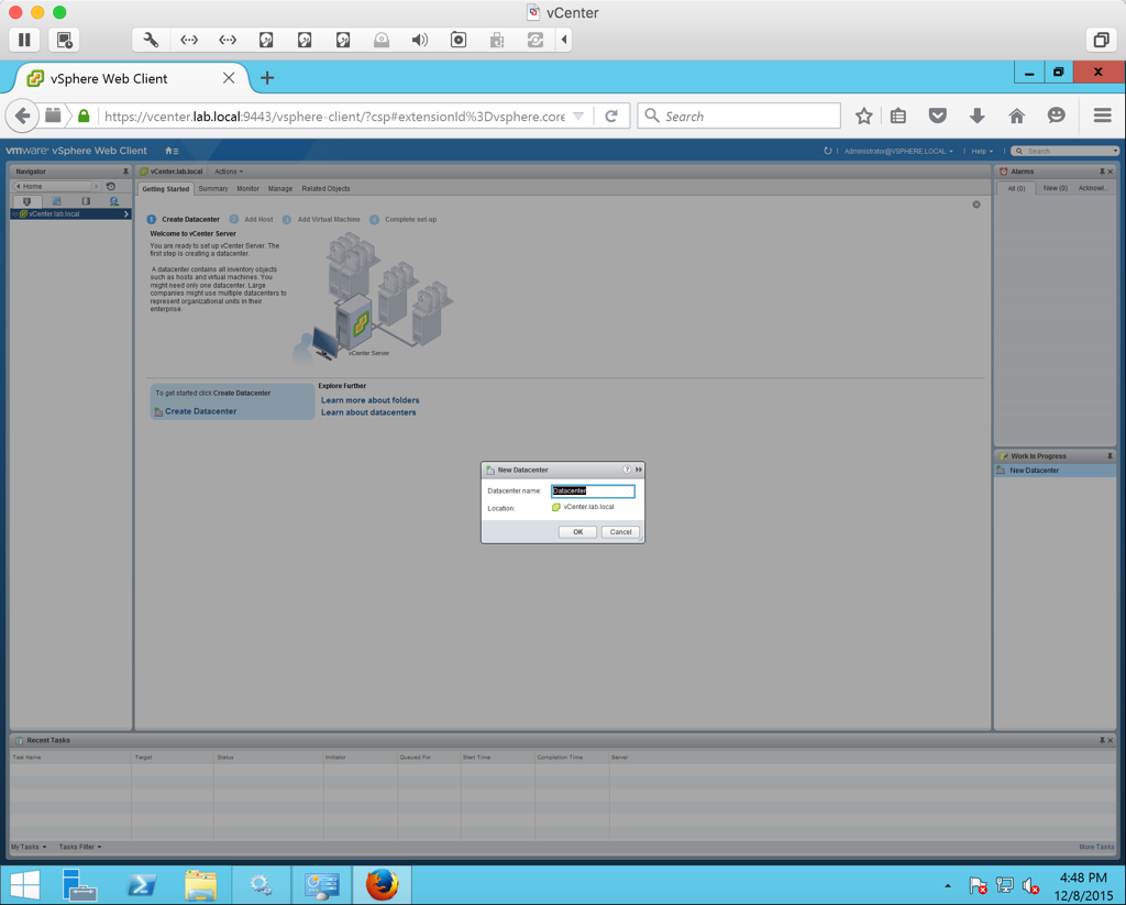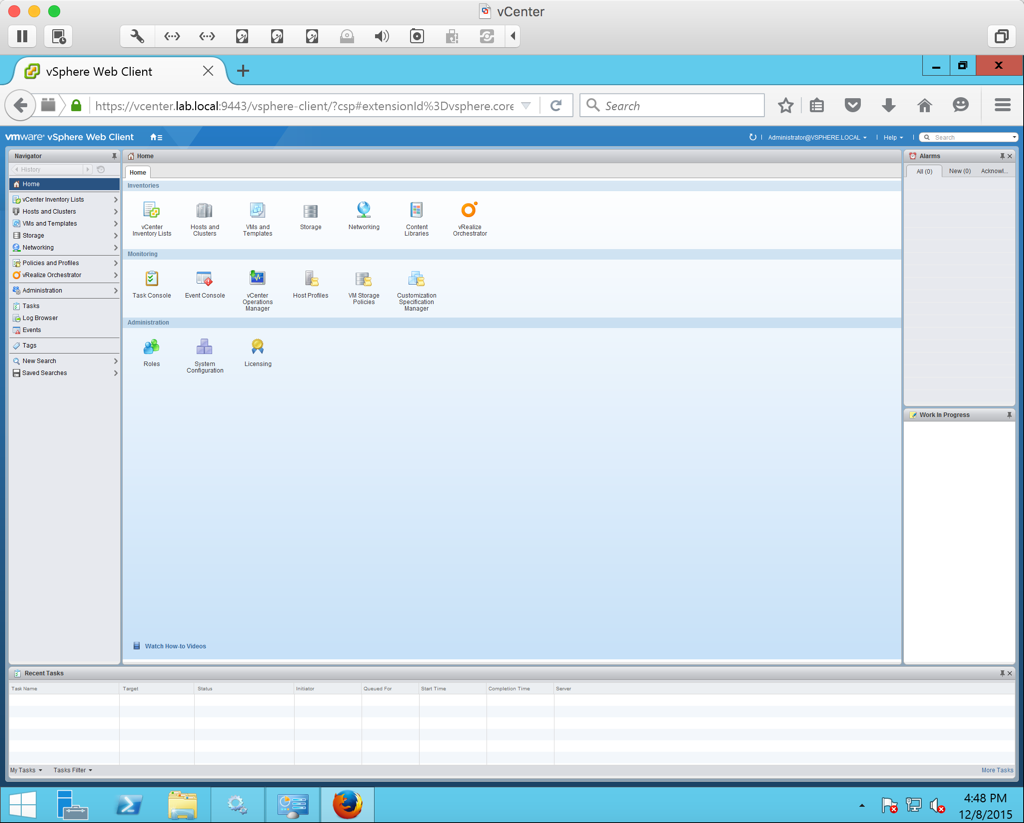Launch the vSphere Web Client and login as administrator@vsphere.local. We are now ready to begin adding our hosts to vCenter