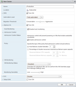 After creating a Datacenter, right click the Datacenter and select New Cluster. Give the cluster a name and turn on HA and DRS by checking the boxes next to the two feature.
