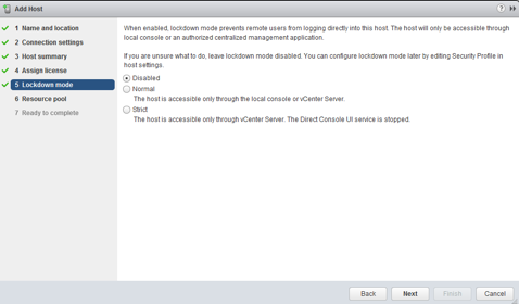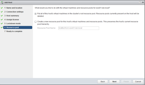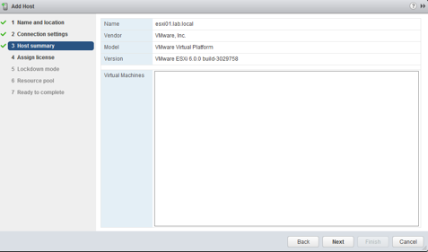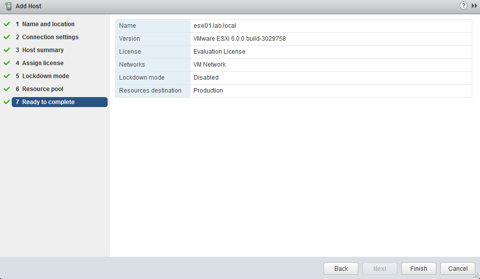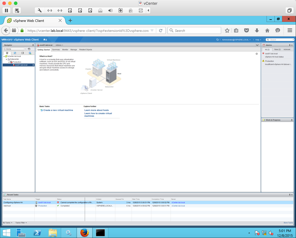 Now the host will be added to the cluster. Note that you will get an error about HA not being able to be configured properly. This is because we do not have our NICs configured yet.