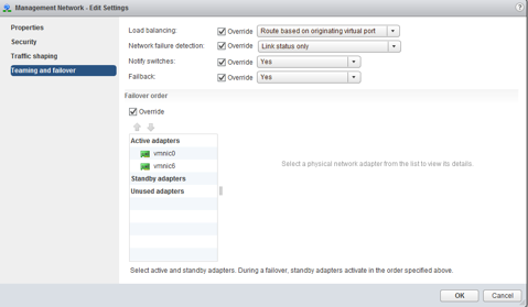 Click Next and Finish. Now Edit the settings of the Management Network port group. Under Teaming and failover, we want to make both adapters active by selecting vmnic6 and using the arrow to move it under Active adapters. Click Ok.
