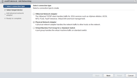 Now let’s add the rest of our NICs to our ESXi host. Right click the host and select Add Networking. Select Physical Network Adapter