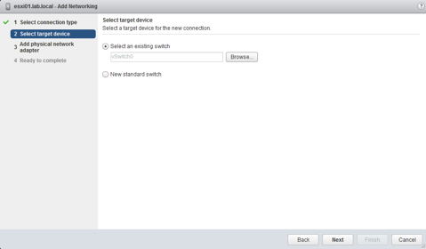 Going back to our web client, let’s add the second NIC to the Management network. Right click the host and select Add Networking. Select Physical Network Adapter