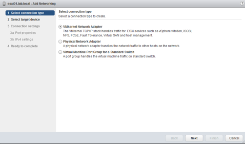 Let’s add our first VMkernel adapter so that we can add the shared storage to our hosts. Right click the host and select Add Networking. Select VMkernal Network Adapter.