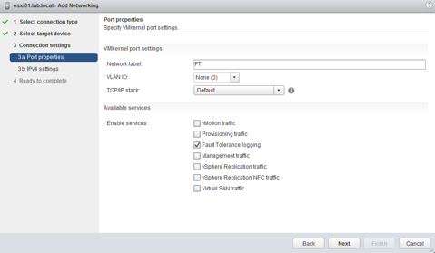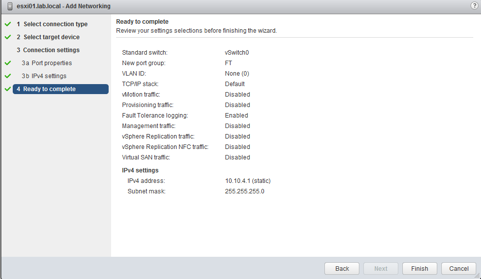 Now let’s create a VMkernal adapter for our Fault Tolerance network. The steps for this are pretty much the same except we need to enable a service, Fault Tolerance logging and the IP address that we assign needs to be apart of the 10.10.4.0 network.
