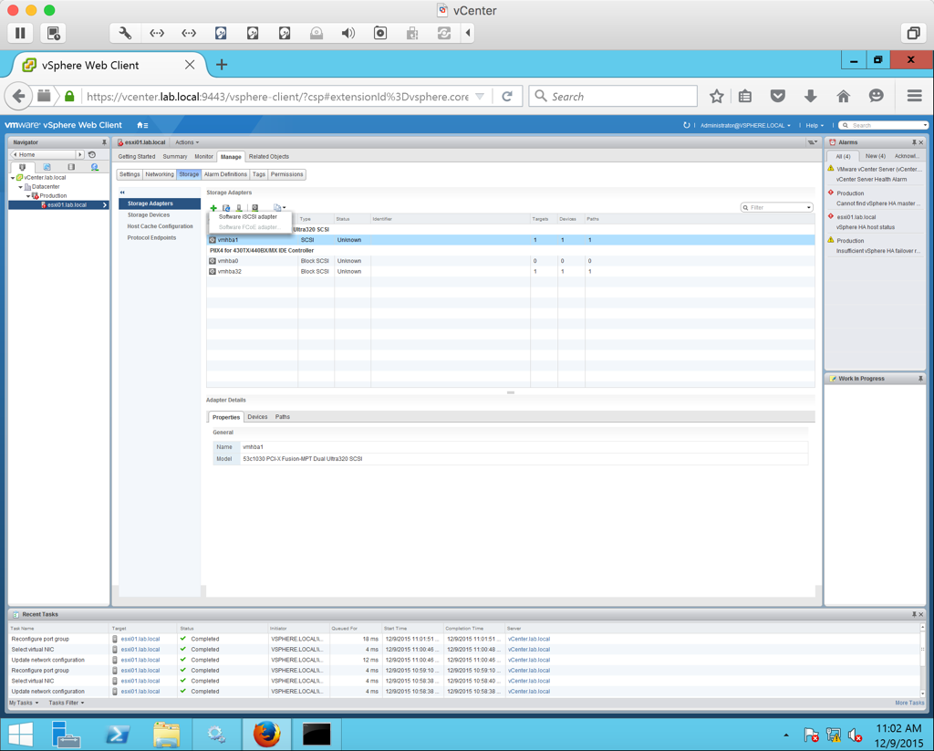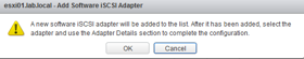 Now we need to add storage to our host. To add our storage, we need to add a Software ISCSI adapter. Do this under the Manage tab of the host. Under Storage > Storage Adapters click the green plus symbol and select software ISCSI adapter