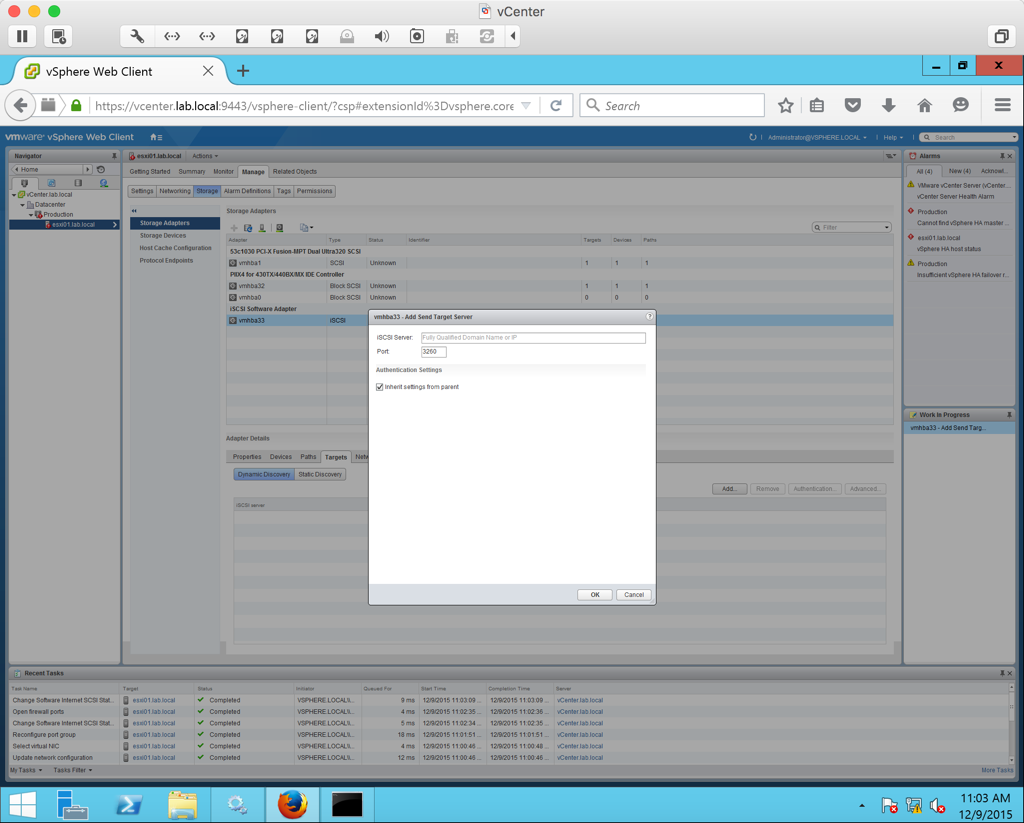 Go to the newly created software adapter and under Targets enter the IP address that we assigned to the ISCSI NIC on our vCenter server.