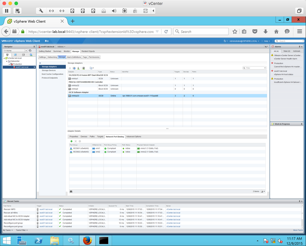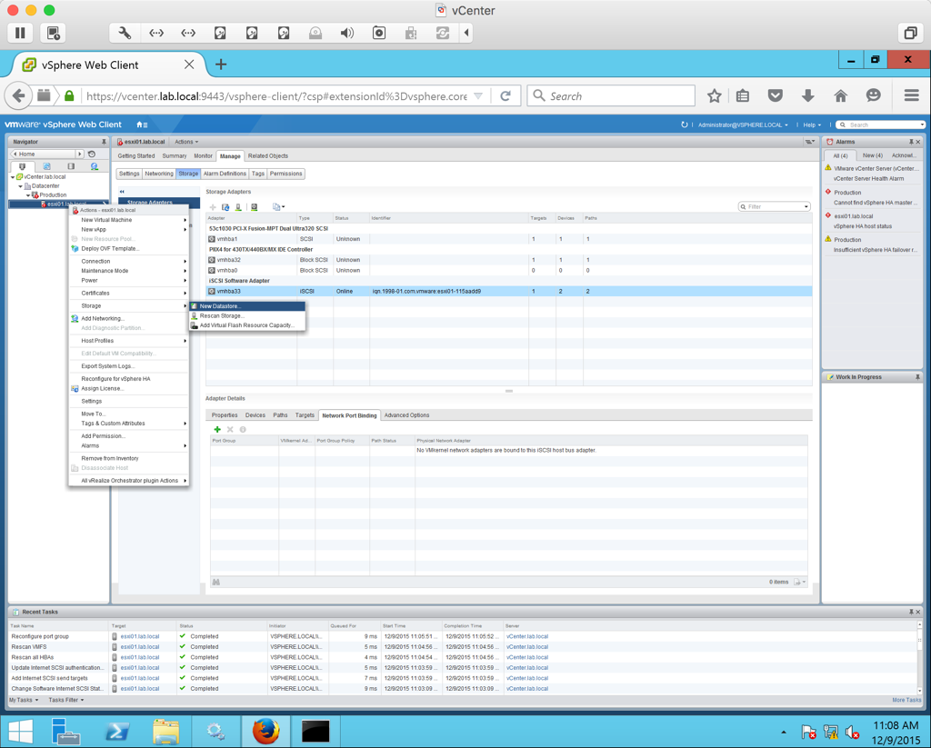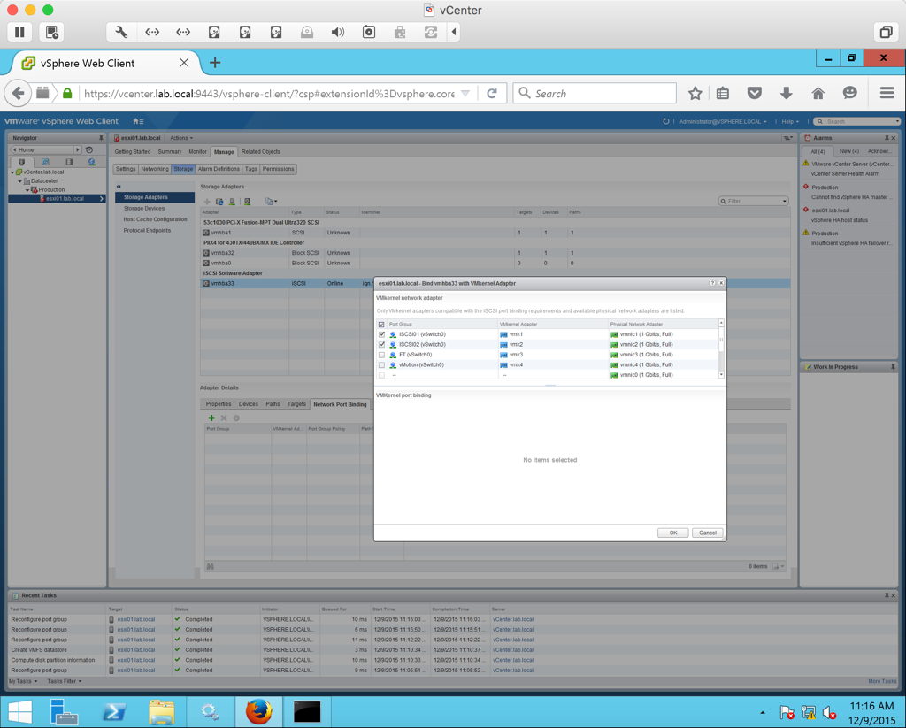 Now we want to create Network Port Bindings so that we can bind the two ISCSI VMkernel port groups (ISCSI01 and ISCSI02) that we created to the software storage adapter. Under the host’s management tab, select Storage >Network Port Binding. Click the green plus symbol. In the list select ISCSI01 and ISCSI02 and click Ok.