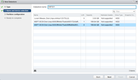 Create a name for the datastore and select the disk in the selection list below. Click Next.
