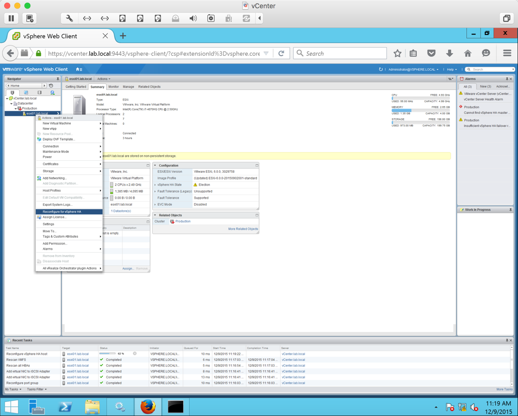 Now that we have all of our networking setup properly, we can go and reconfigure HA. Right click the host and select Reconfigure for vSphere HA