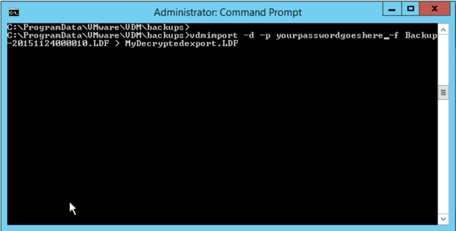 Next you will use the vdmimport command to access the backup file, decrypt it and place the decrypted file in the backup directory.