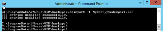Now Import the decrypted LDIF file to restore the View LDAP configuration. For example: vdmimport -f MyDecryptedexport.LDF