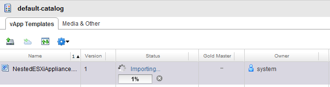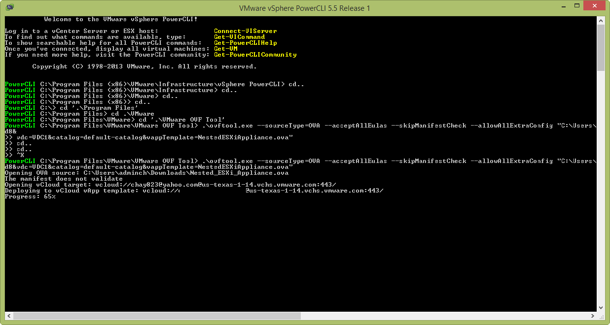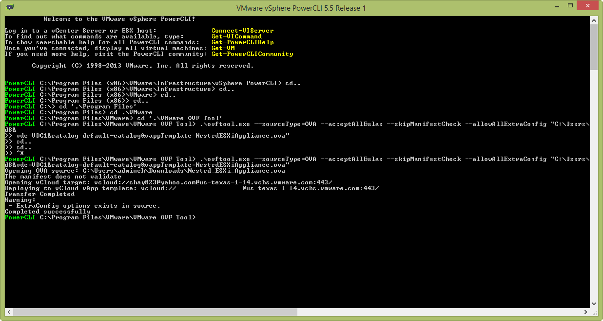 ovftool –sourceType=OVA –acceptAllEulas –skipManifestCheck –allowAllExtraConfig “C:\Users\adminch\Downloads\Nested_ESXi_Appliance.ova” “vcloud://johndoe@yahoo.com:$3cret123@us-texas-1-12.vchs.vmware.com?org=e6e037d0-6bd4-4925-a8ef-bdc8b418c7d8&vdc=VDC1&catalog=default-catalog&vappTemplate=NestedESXiAppliance.ova”
