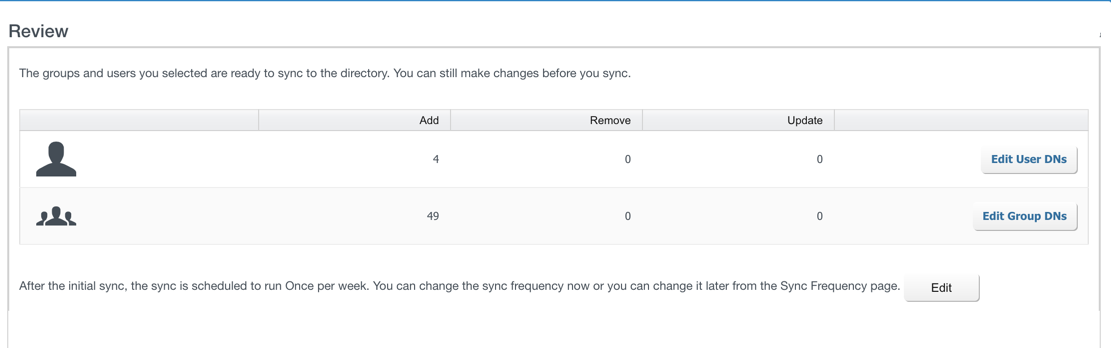 Here, we will specify what users we want to sync with the directory. You can make this as granular as you want and you can add multiple user DNs. I want to sync the entire domain so will enter the domain DN. Click Save.
