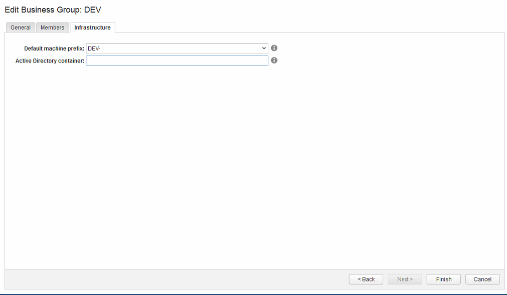 Under the Infrastructure tab is where our machine prefix comes into play that we created. Select the machine prefix from the drop down box. Click Finish.