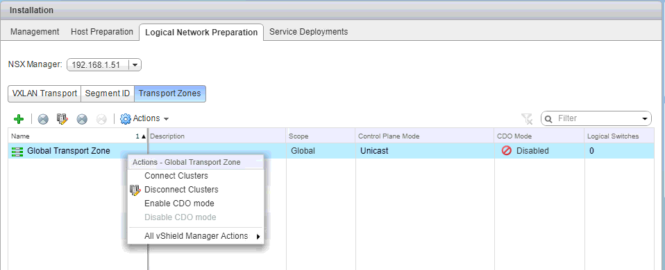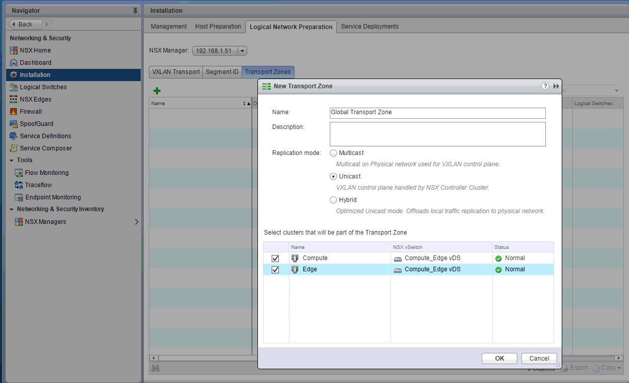 To create a transport zone, navigate to Networking & Security > Installation > Logical Network Preparation > Transport Zones and click the green +. Select the clusters and replication mode that you want to use. Click OK.