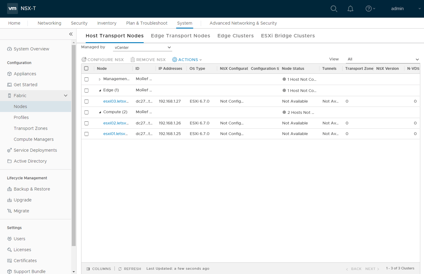 To being configuring a ESXi host transport node, log in to the NSX Manager with admin credentials. Navigate to System > Fabric > Nodes > Host Transport Nodes. Click the drop down beside “Managed By” and select your vCenter.