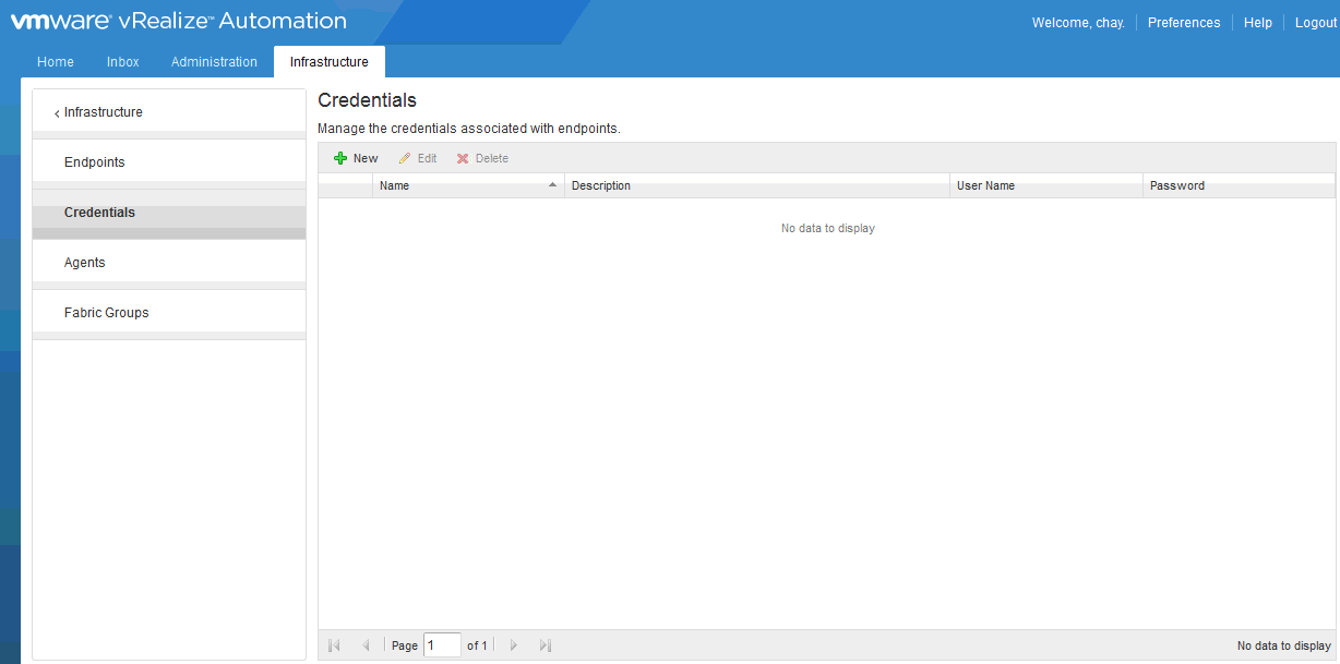 So far, we’ve created our tenant and we got the tenant setup with Active Directory authentication. The next step we want to take is to create a vSphere endpoint that will allow vRealize Automation to communicate with the vSphere environment and discover compute resources, collect data, and provision machines. To begin, we must first login to our tenant as a IaaS administrator. Once we have done that, we want to navigate to Infrastructure > Credentials to enter in the credentials that the endpoint will use to login in order to see the available resources. Click New.